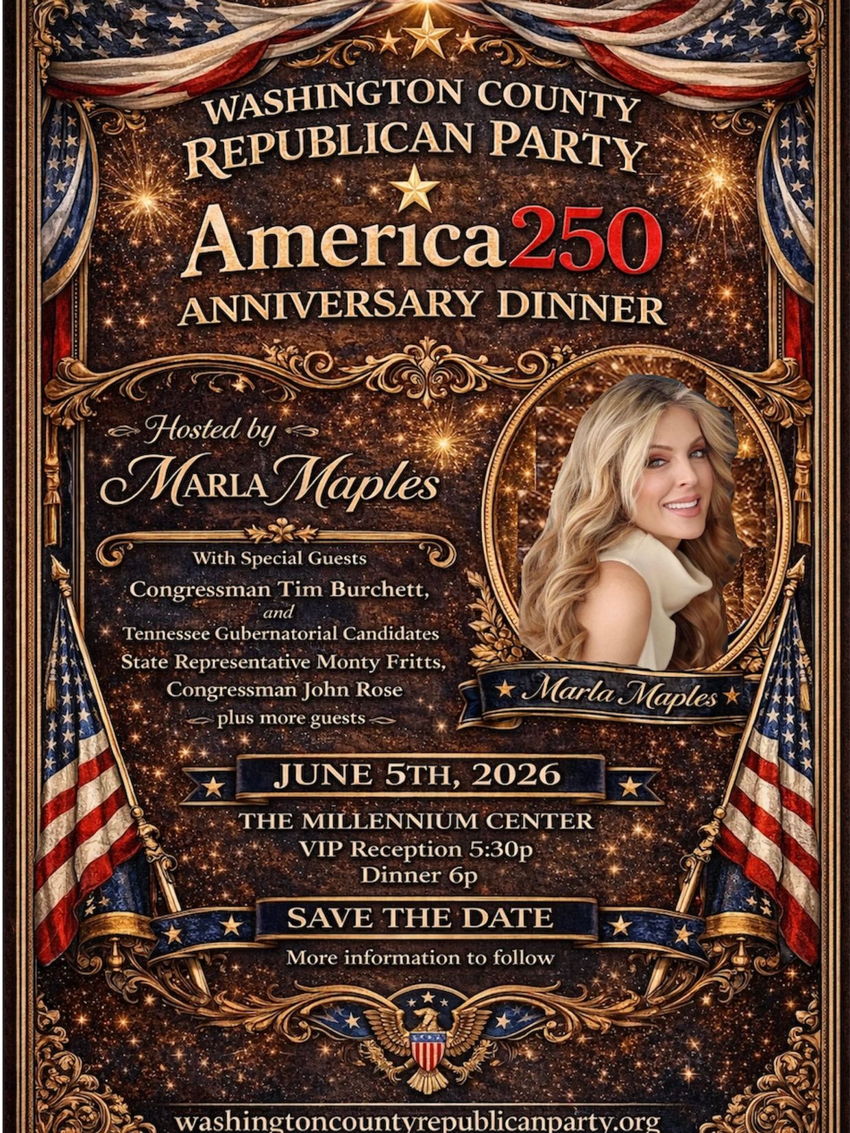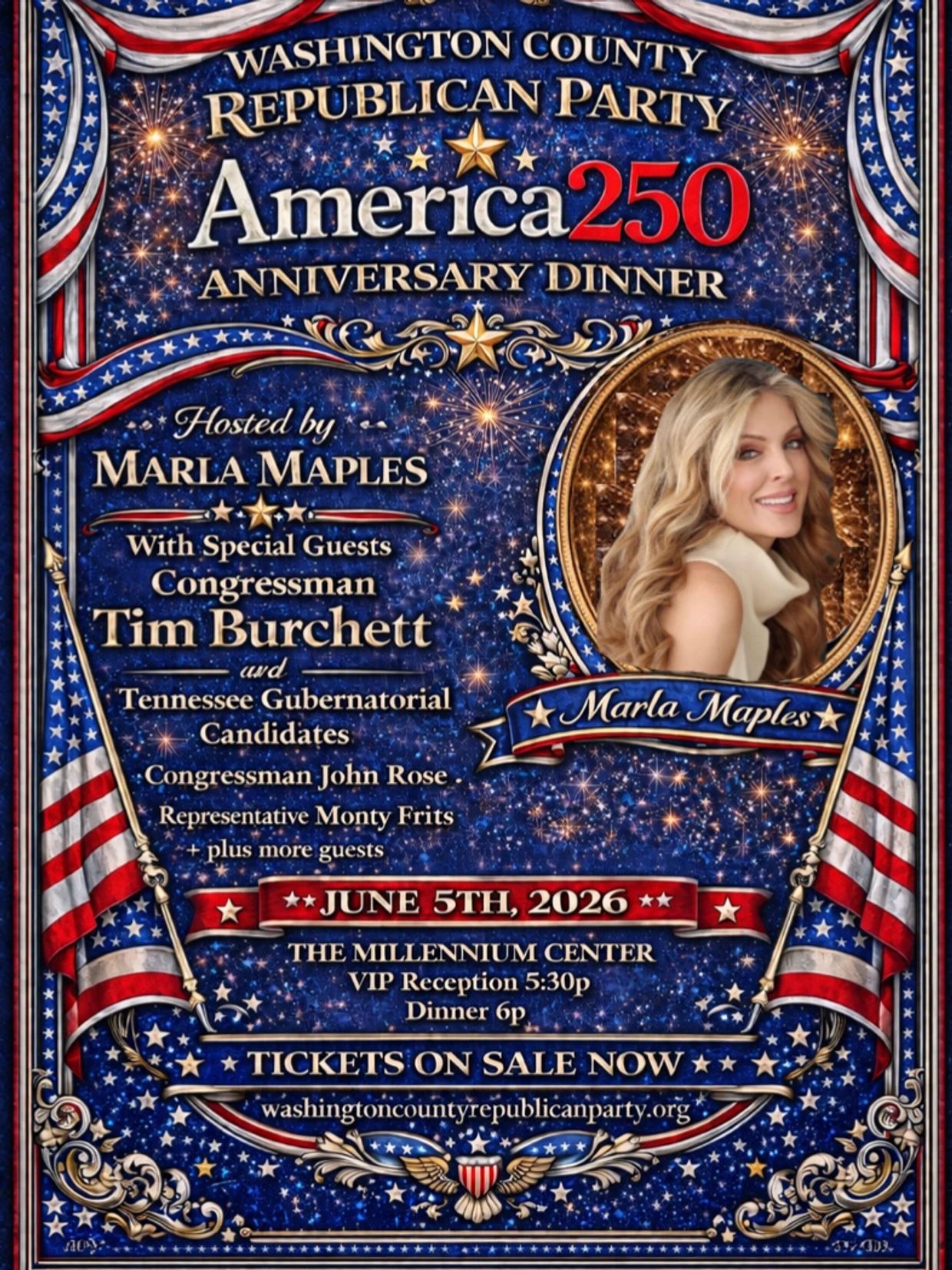With event host American icon and MAHA Maven Marla Maples, credited with connecting Bobby Kennedy and Trump! Marla has been championing MAHA efforts in her state of Florida and across the country. Tennessee favorite Congressman Tim Burchett will be here and so will the Gubernatorial candidates and area politicians. Let's celebrate freedom and how we can keep it with fellow area Republicans. Ticket and sponsor information below! Tickets on sale now! We sold out last year so tell your friends now!